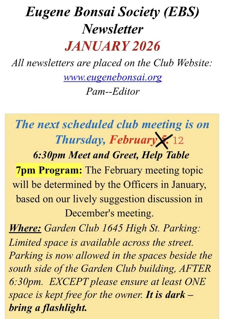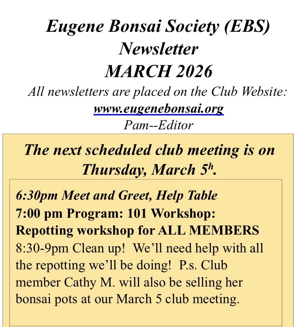 The Eugene Bonsai Society is a group of like-minded individuals dedicated to the ancient art of bonsai. Our membership ranges from experienced individuals to first time enthusiasts and we’re always in search of more people who share our love for miniature trees. Within this website you will find resources designed to increase your knowledge of bonsai as well as information about what our Society is up to and other bonsai-related events of special note.